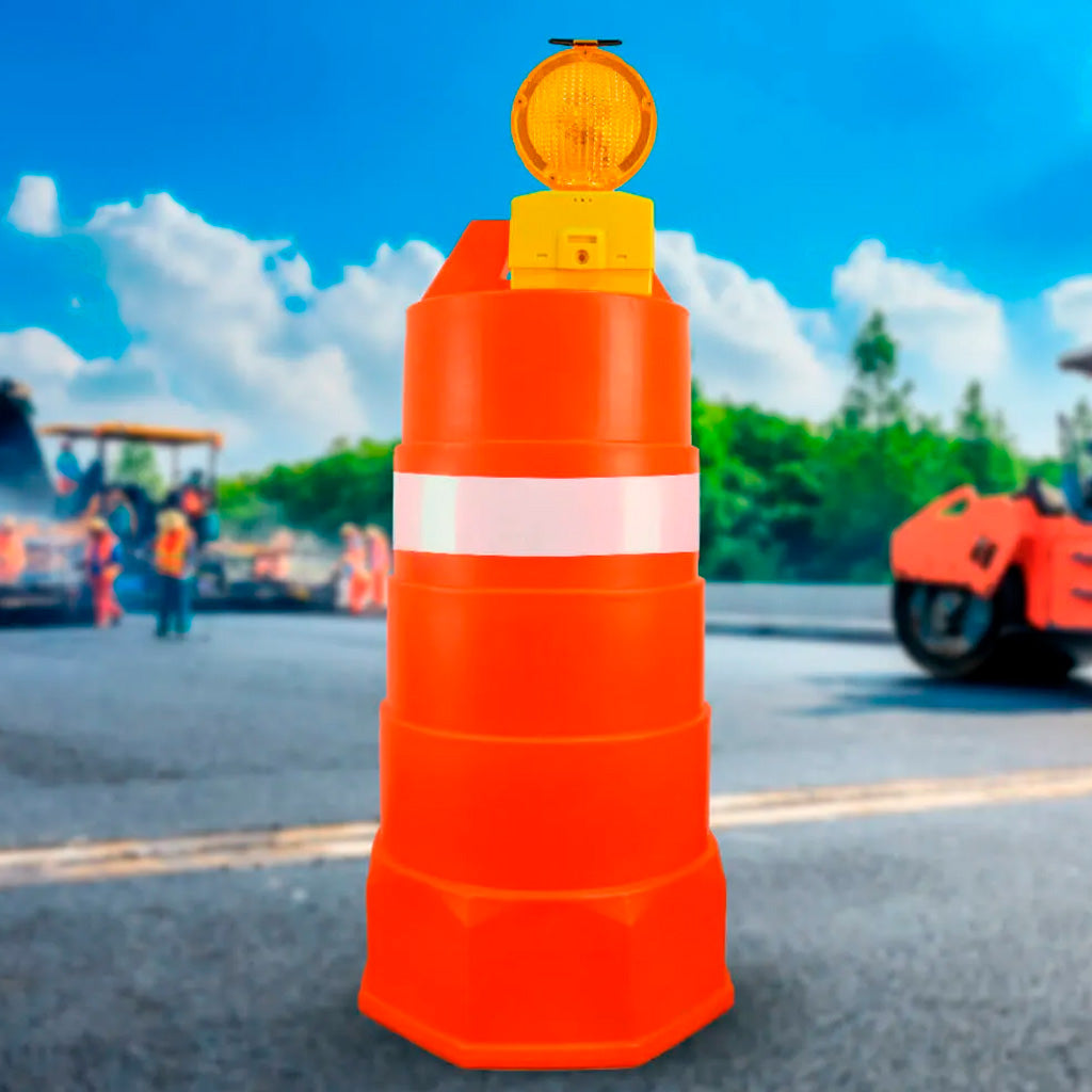 Cuenta con una altura de 99 cm, un diámetro superior: 40 cm y un diámetro inferior: 55 cm. Posee un asa que hace su uso cómodo y, además, está diseñada para facilitar el movimiento y posicionamiento de lámparas viales.